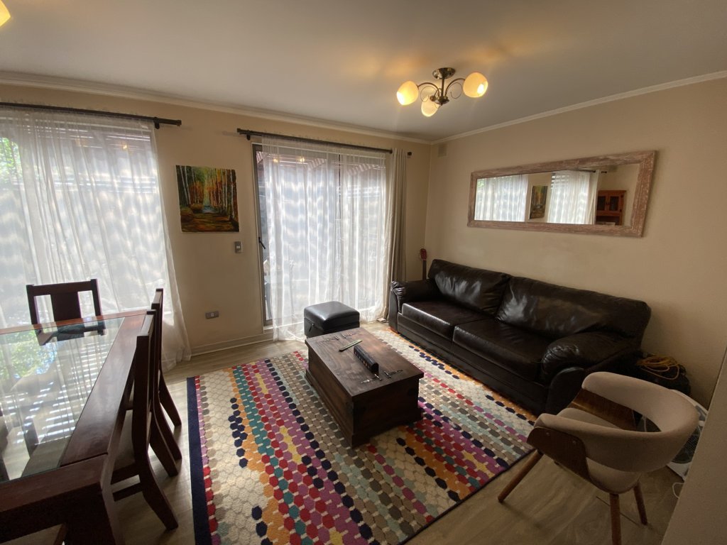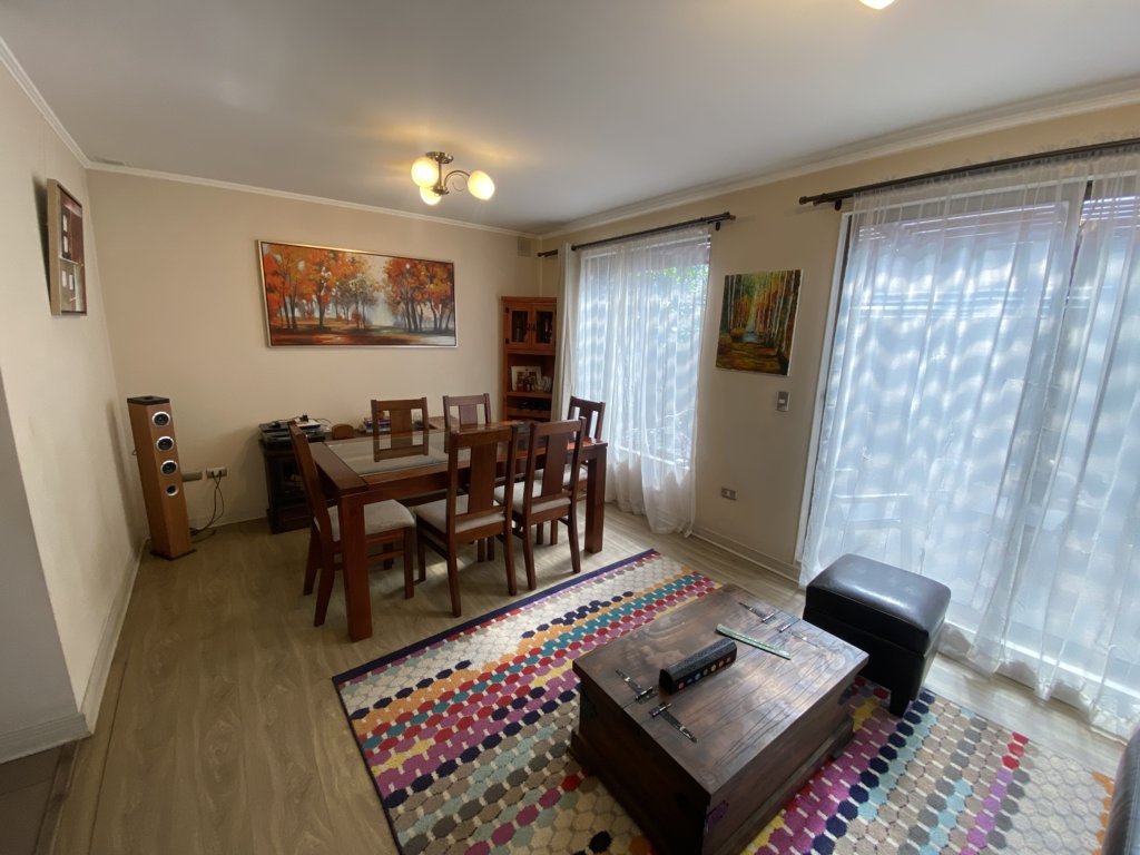 Patio con quincho, bodega cerrada, antejardín, estacionamiento 2 vehículos.