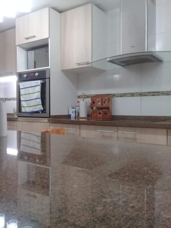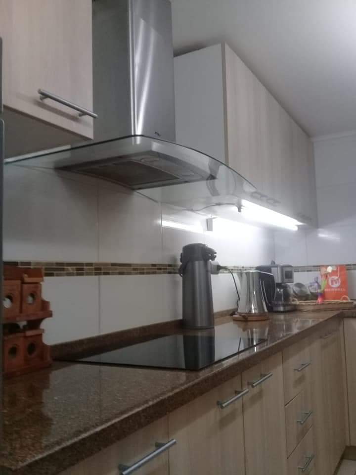 Living comedor, cocina amoblada y equipada con encimera, horno y campana, baño de visitas, sala estar.