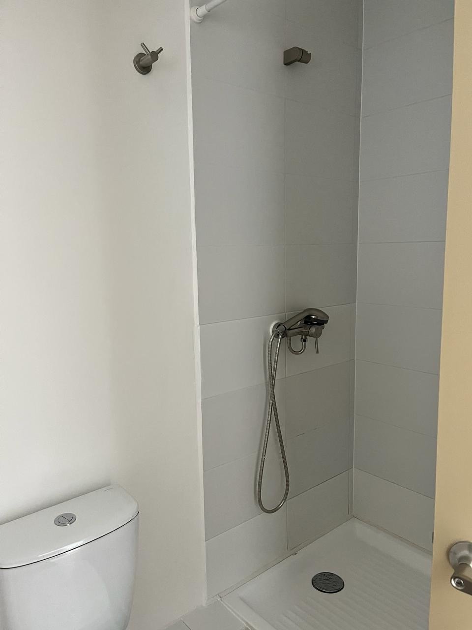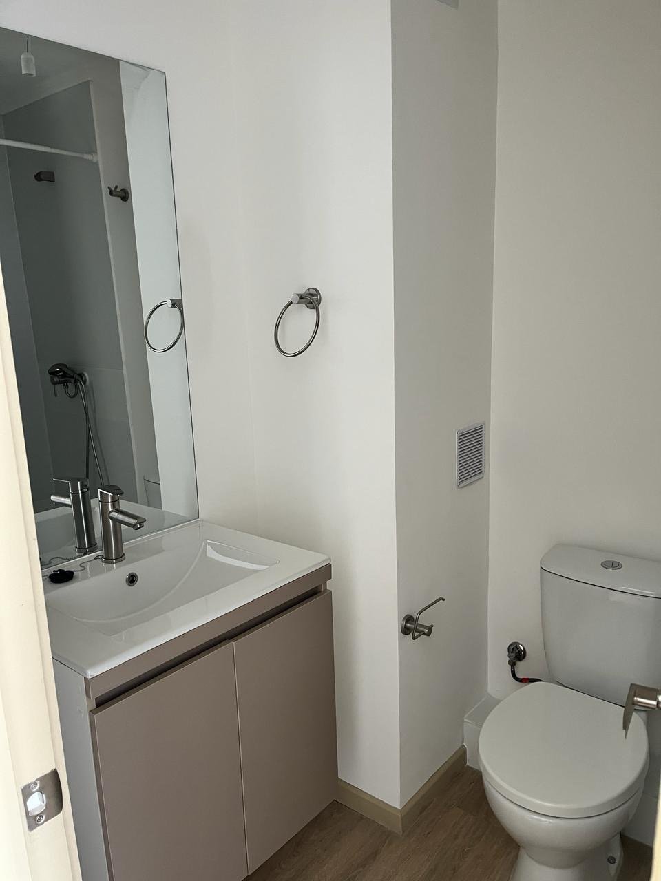 Cocina americana amoblada y equipada con encimera, horno, campana, conexión a lavadora, termo eléctrico, baño.