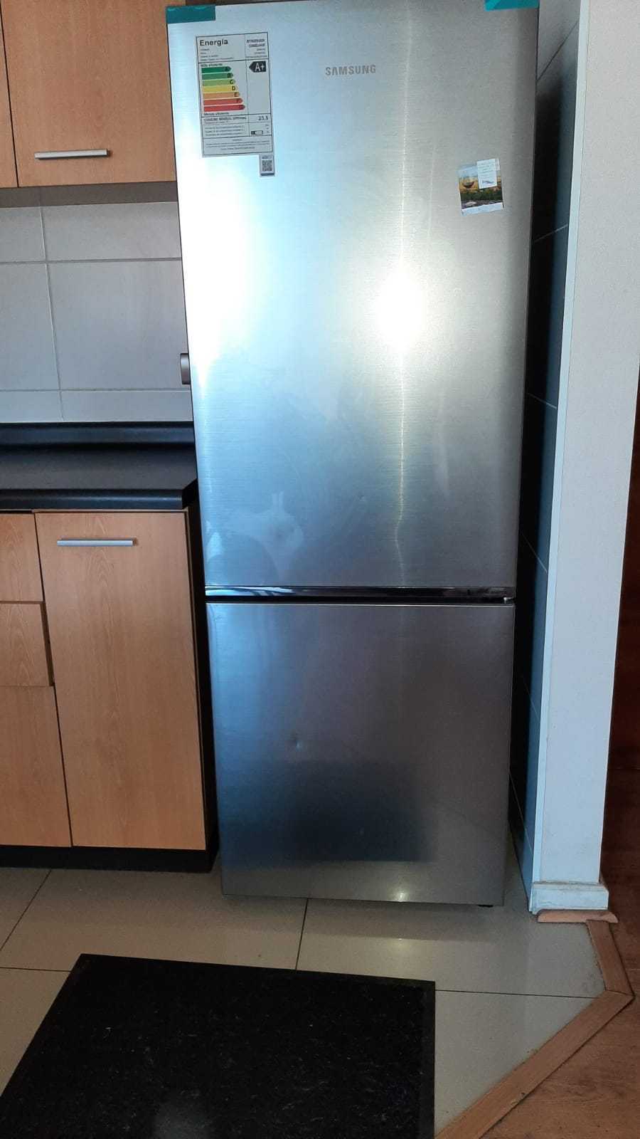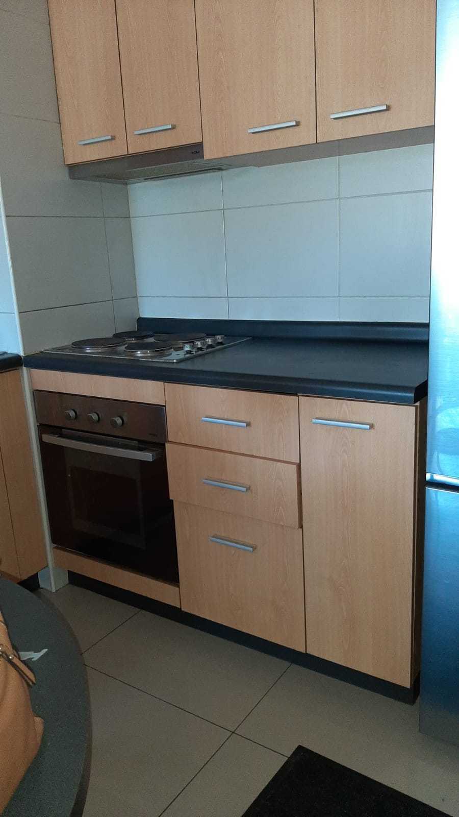 Living con cocina americana amoblada y equipada con encimera, horno, campana, refrigerador, balcón, 2 dormitorios y baño.