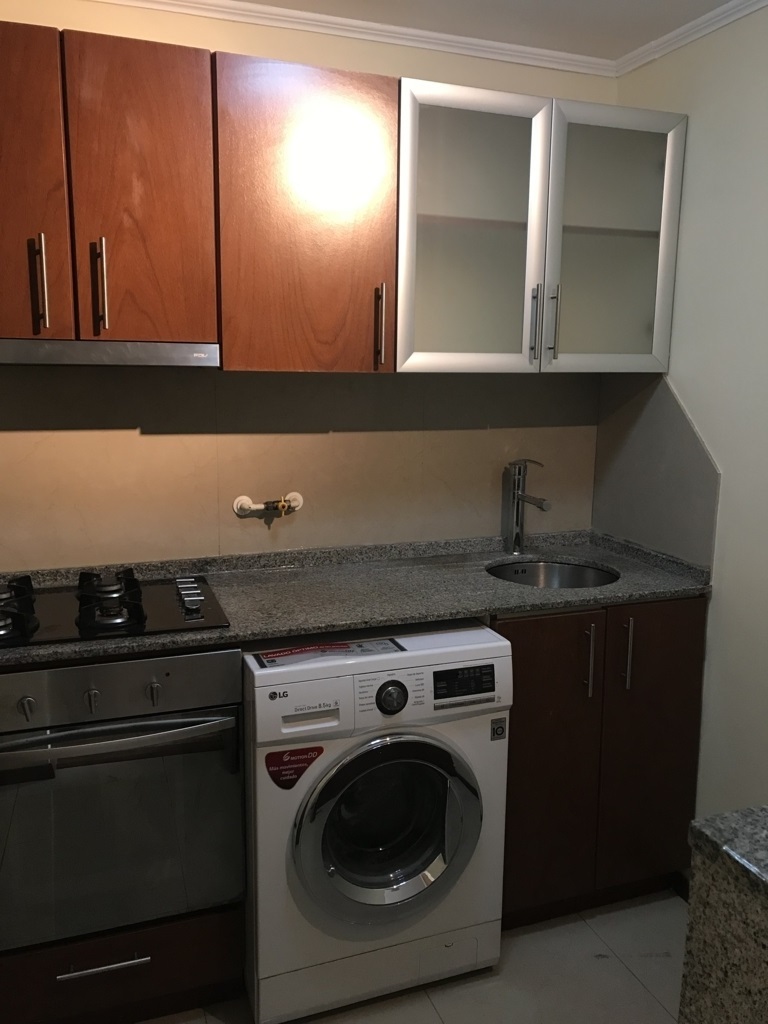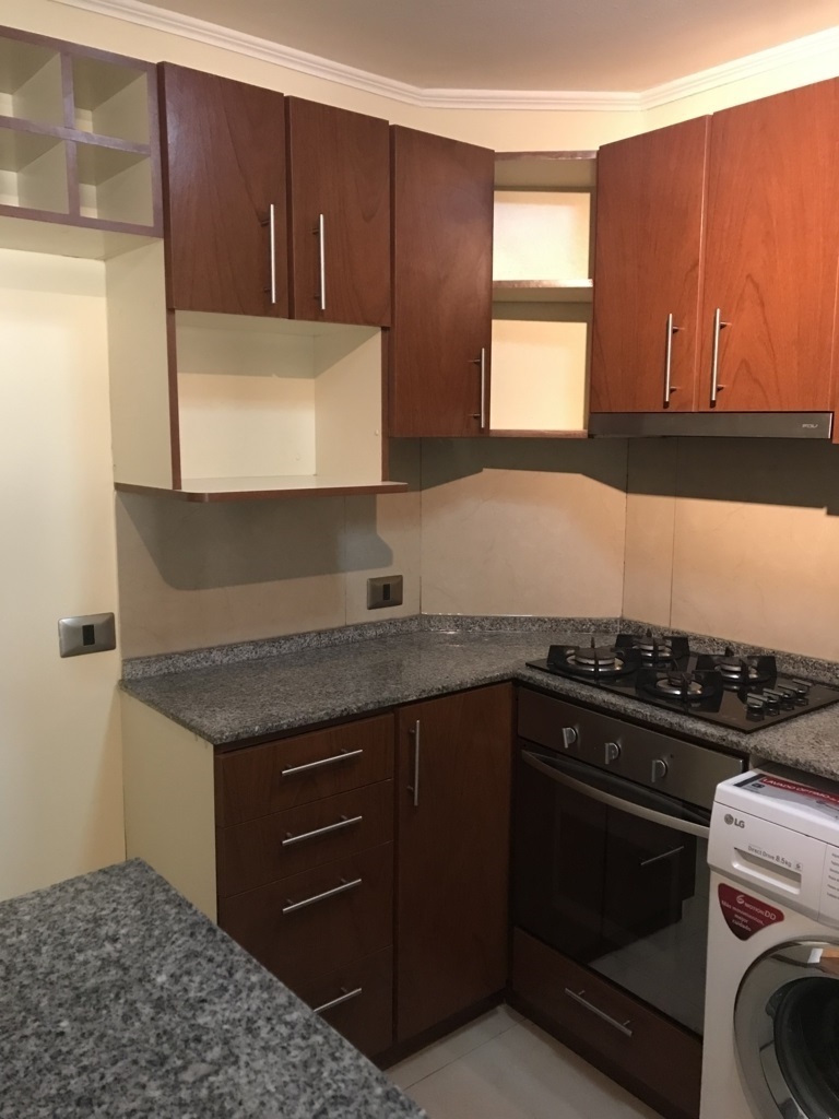 Living con cocina americana amoblada y equipada con encimera, horno y campana, 2 dormitorios, 1 baño.