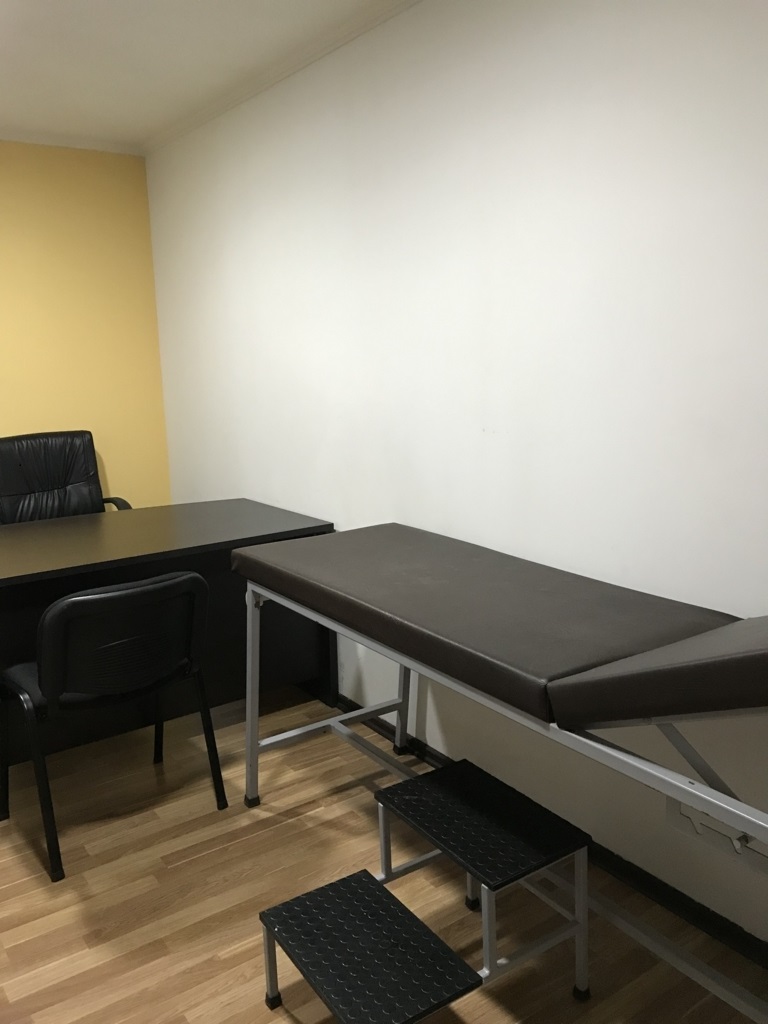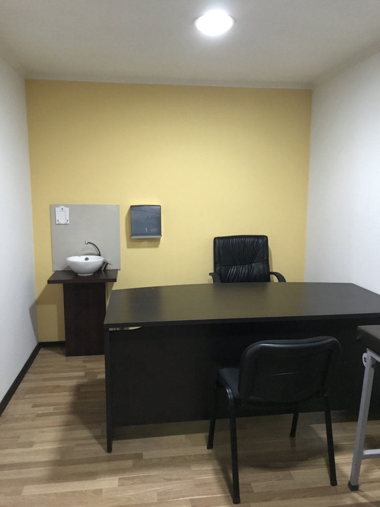 Arriendo incluye: escritorio, sillón giratorio de escritorio con brazos, 2 sillas sin brazos, camilla, escabel, lavamanos, mueble base lavamanos, dispensador toalla, dispensador jabón, basurero metálico.